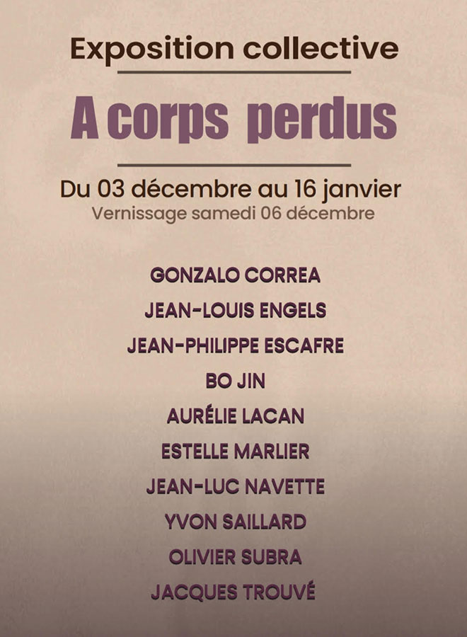 Avec Gonzalo Correa, Jean-Louis Engels, Jean-Philippe Escafre, Bo Jin, Aurélie Lacan, Estelle Marlier, Jean-Luc Navette, Yvon Saillard, Olivier Subra et Jacques Trouvé. Autour de la thématique de la transfiguration du corps, les artistes de la galerie sont invités à questionner sa représentation contemporaine, jusqu’à sa déconstruction, voire sa disparition.