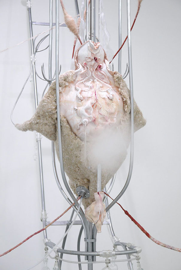 « Dans mes installations immersives, je cherche à hybrider l’organique et l’industriel, explorant les mécanismes de soin contemporains à travers un corps-machine. Mes œuvres questionnent la mécanisation de nos corps au travail et leur défaillance potentielle. J’imagine une fabrique intime et imparfaite où les engrenages, semblant prêts à s’agiter comme des organes vitaux, trahissent leur surchauffe émotionnelle.
