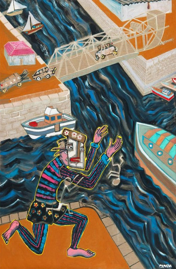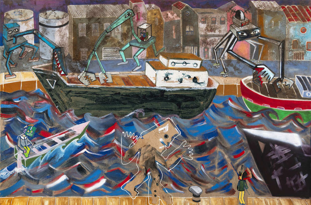 Elles donnent à voir un territoire sétois peuplé de monstres, de fantômes et de souvenirs, mais également des territoires imaginaires qui incarnent le déplacement de l’artiste dans l’espace géographique de notre planète autant que dans son espace mental qui s’élargit au fil de ses voyages. Certaines œuvres majeures de l’Histoire de l’art font également écho pour lui à l’actualité la plus brûlante et son travail de réinterprétation en fait résonner la force dramatique