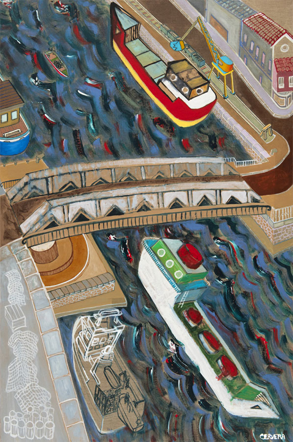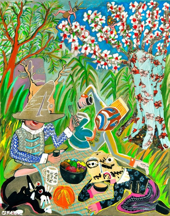 Enfin, peintre du « quotidien extraordinaire », André Cervera nous propose une traversée entre réel et imaginaire, entre visible et invisible Ses peintures sont nourries autant par son expérience vécue que par ses projections imaginaires. Les masques mettent en évidence comment les archétypes sociaux, les forces pulsionnelles viennent troubler l’identité ou viennent la révéler dans sa vérité complexe et mutable La fascination de l’artiste pour le chamanisme ou la magie tend à faire de la peinture un rituel dont on ne sait pas s’il cherche l’intercession, la conjuration ou la conciliation des forces qui nous dépassent, s’il peut réparer la morsure du temps