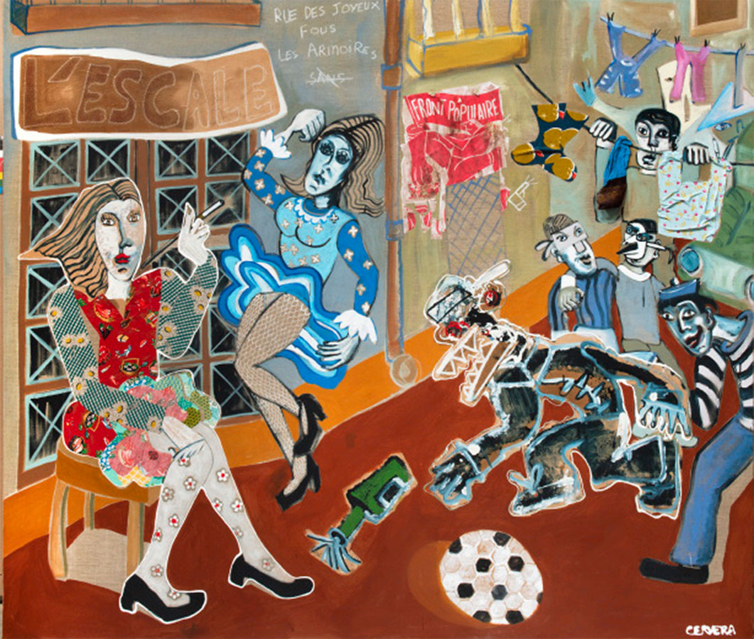 André Cervera a développé un art singulier autour d’une esthétique du carambolage où se percutent la multiplicité des références culturelles et artistiques, où l’hybridation est érigée en principe plastique, où la révérence aux grandes œuvres de l’Histoire de l’art le dispute à la remise en cause de toute hiérarchie artistique La fragmentation et l’hétérogénéité aussi bien des techniques que des références plastiques et mémorielles trouvent leur résolution dans l’art du montage visuel, où la composition picturale adopte la logique d’un plan cinématographique