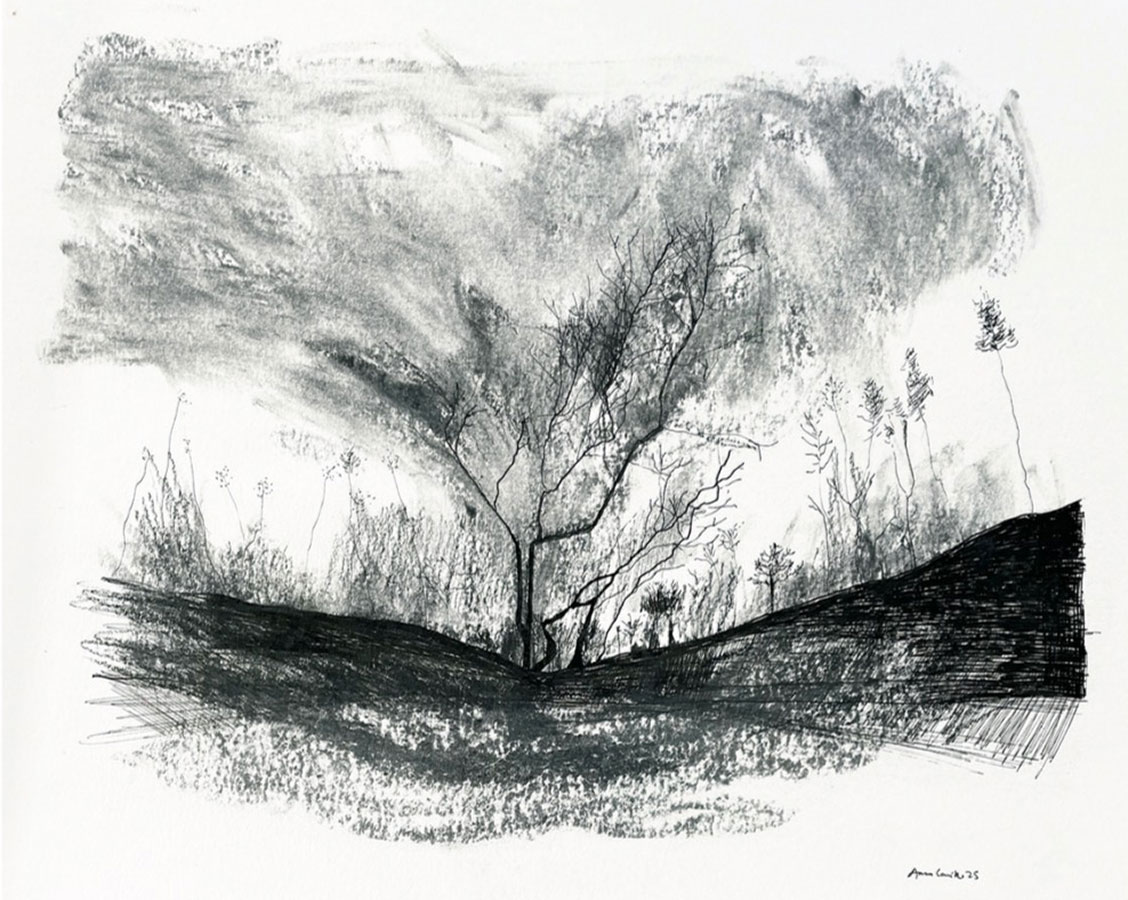 Après le mégafeu qui a dévasté les Corbières le 5 août 2025 Anna prend sa plume ses fusains ses encres pour une série bouleversante « là où il y avait la beauté, là où tout est détruit, je vois encore de la beauté et j’essaie de partager ce regard dans mes dessins des silhouettes des arbres, des roches et des collines des alentours.
