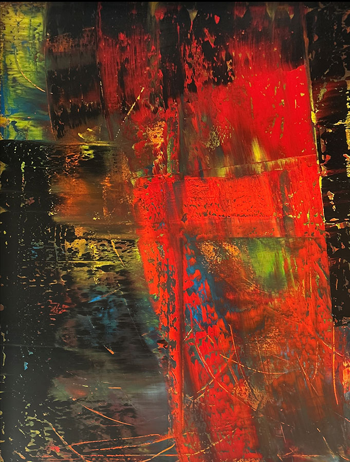 Ses tableaux sont le résultat d’un processus d’auto-construction visuelle, où, placé en position de retrait, il laisse les outils (grattoirs, couteaux) et le matériau (peinture à l’huile, acrylique et autres médiums) interagir de manière presque autonome. L’incertitude, l’instabilité, l’aléatoire et l’incontrôlable deviennent des éléments essentiels de sa création artistique. Les teintes sont souvent juxtaposées dans un équilibre fragile : des couleurs chaudes côtoient des tons froids, des zones opaques rencontrent des zones presque translucides.