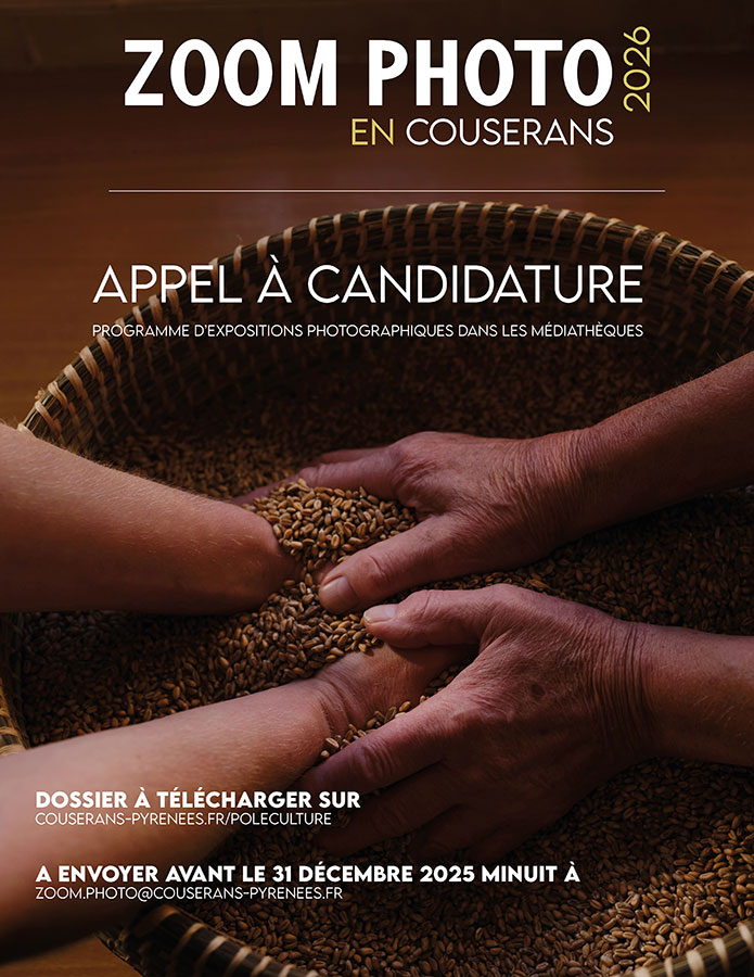 Le Zoom Photo est un programme d’expositions sur l’ensemble du Couserans, dans les médiathèques, au Château de Seix et dans le Bus – espace culturel mobile et en lien avec le Lum Festival. Il est initié par l’Agence de Développement de l’Économie Culturelle en Couserans et coordonné par l’association Autres directions et le Pôle Culture de laCommunauté de Communes Couserans-Pyrénées.