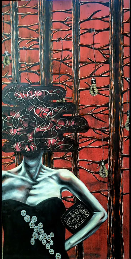Elle y pose ses révoltes aux formes chaotiques en une géométrie maîtrisée qui s’ordonne tout en force et en netteté. Rien d’évident ni de choquant dans ses traitements graphiques dont la symbolique invite le spectateur à s’interroger et à rechercher au-delà de l’effet esthétique, le message.