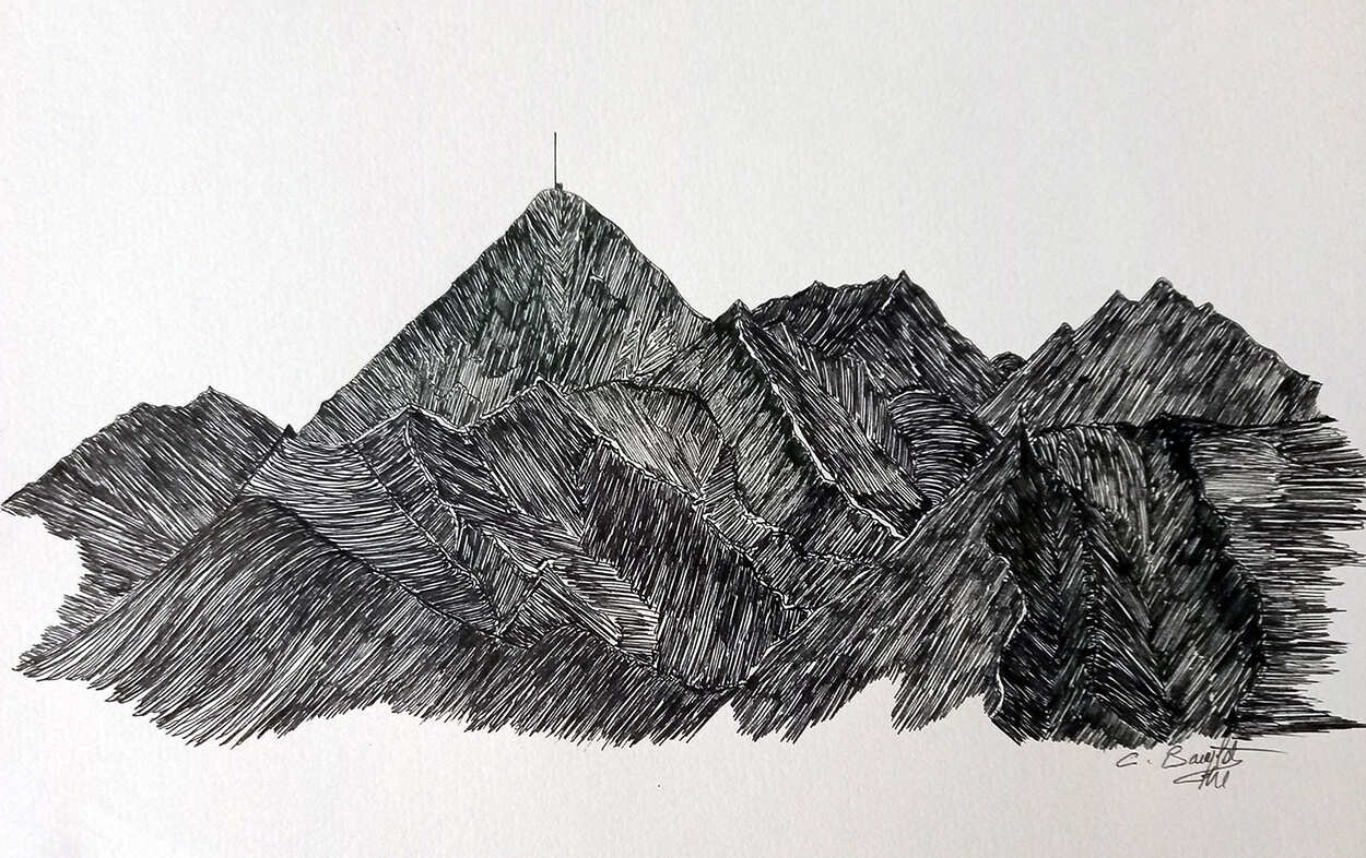 Je réinterprète la montagne, je veux donner au trait la profondeur que l’œil perçoit et que l’appareil photo ignore. J’invite aussi mon public à redécouvrir la montagne à travers cette multitude de milliers de traits qui brouille les frontières entre le réel qui nous entoure et ce qui se trouve au plus profond de nous. J’avais besoin de trouver le geste qui contrôlerait, guiderait et apaiserait mes émotions. »