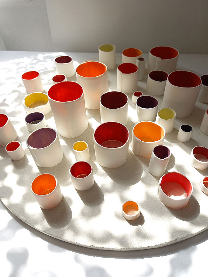 Catherine CROZON explore l’impalpable rencontre de la couleur et de la matière avec la lumière. Elle suscite leurs vibrations colorées, révélant au fil des variations du jour l’instant présent entre tangible et intangible.
