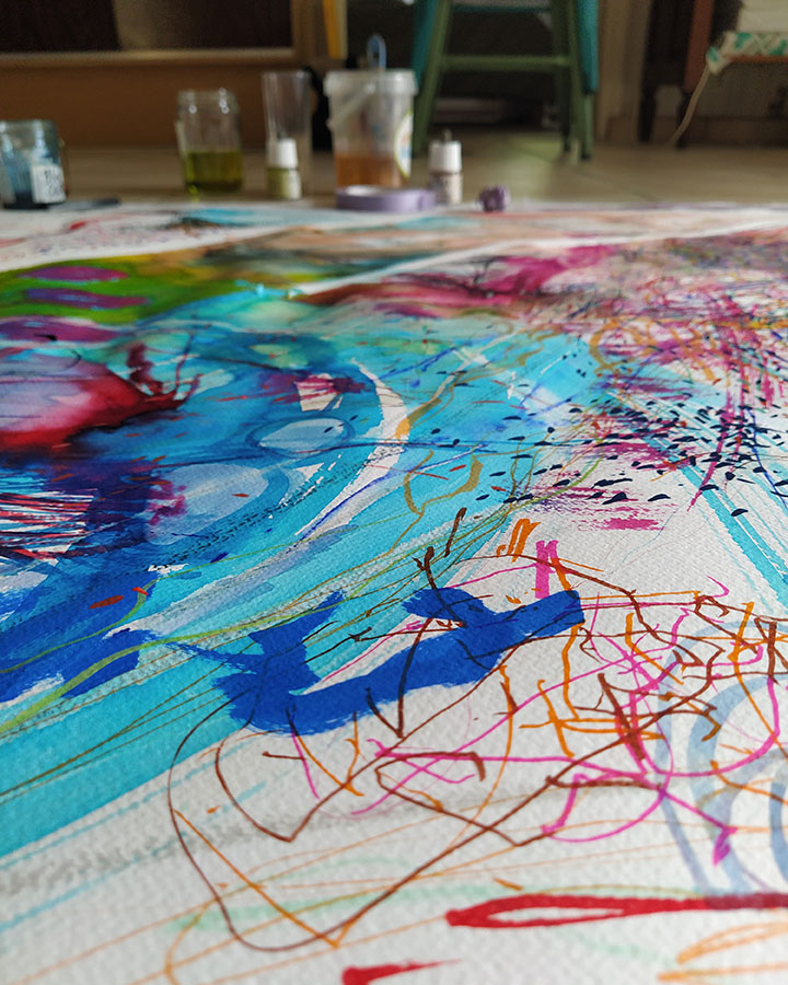 Au sol, sur une grande surface de papier, les deux artistes dessinent simultanément.