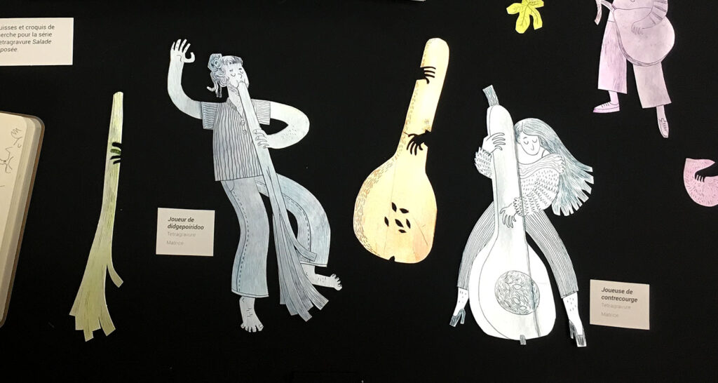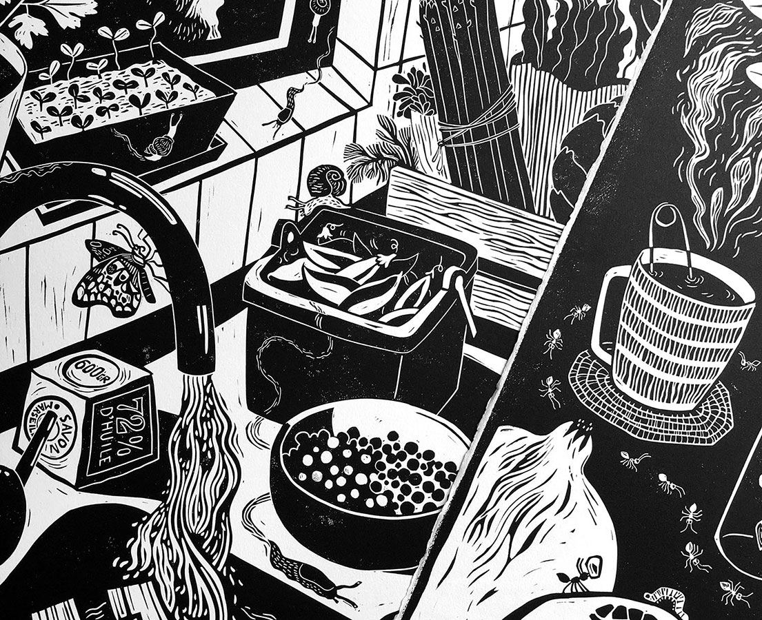 Au menu de cette exposition, Élice nous sert 3 séries d’estampes vitaminées travaillées avec des techniques différentes. À la gouge ou la pointe sèche, dans le lino ou le tetrapak, elle creuse une ligne souple, fluide, toujours en mouvement. Le choix des cadrages et le soucis du détail, influencés par sa formation en illustration/bande-dessinée, amènent souvent une lecture narrative de son travail.