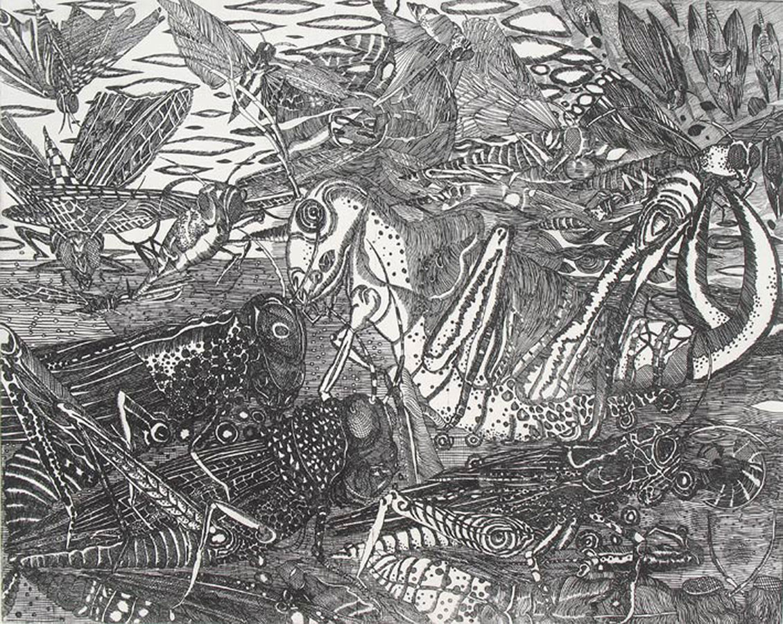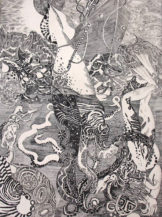 La réalité et le rêve se rencontrent dans un langage de formes variées. Elle tisse des éléments constructifs et figuratifs, elle fait écho au surréalisme et au réalisme magique. Elle maîtrise la précision puissante du graveur allemand classique, d’Albrecht Dürer à Karl Georg Hirsch.
