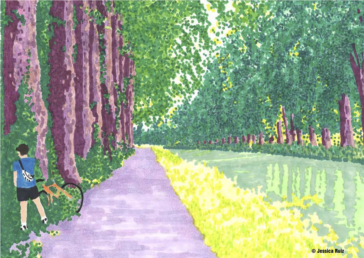 En vacances avec Jeannie L retrace une épopée artistique à bicyclette, où les artistes du collectif WOAWAOW et Sophie Borthwick ont été invités à rejoindre un groupe de 30 personnes à bicyclette lancé à tout allure sur la piste cyclable du canal latéral de la Garonne.