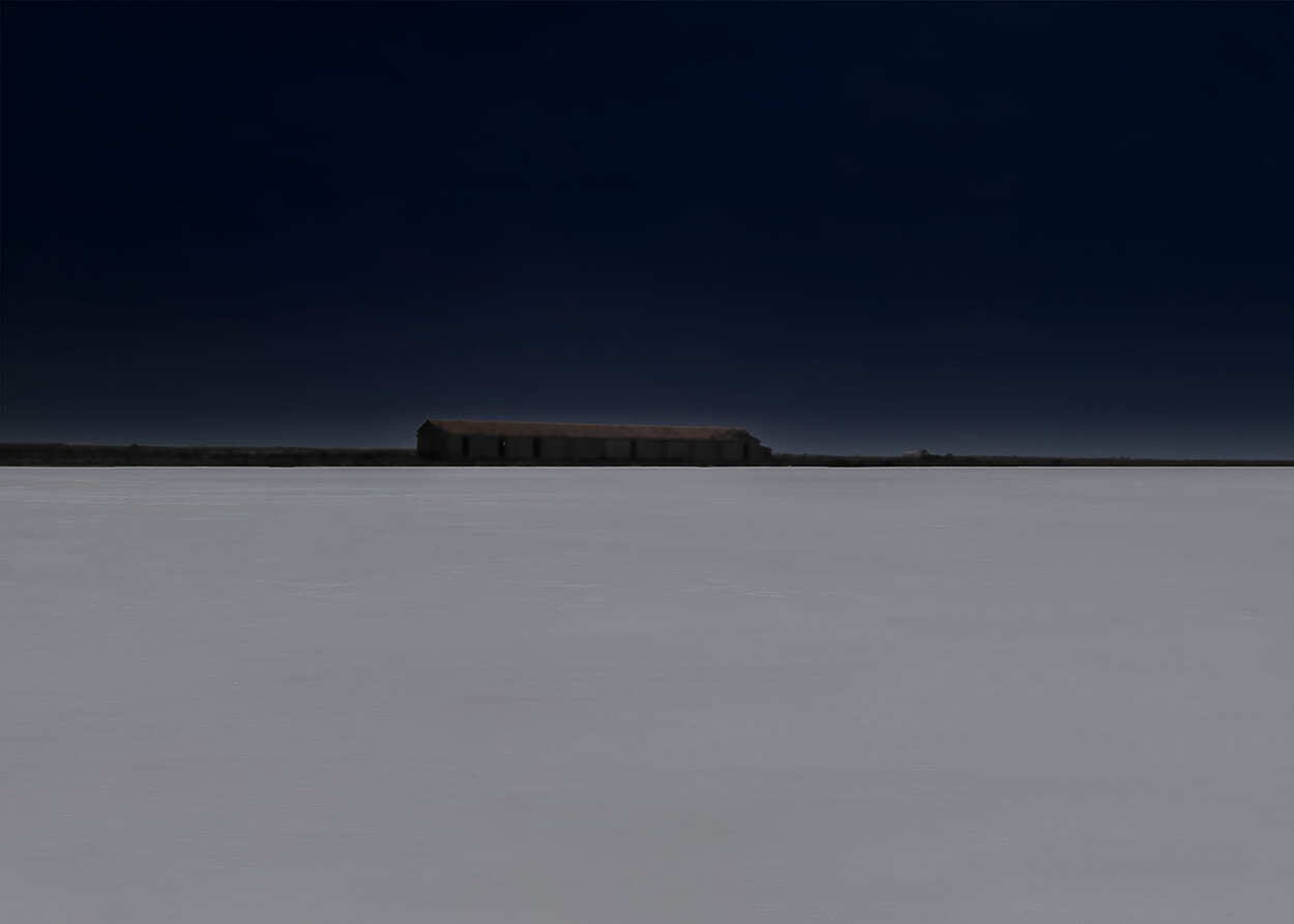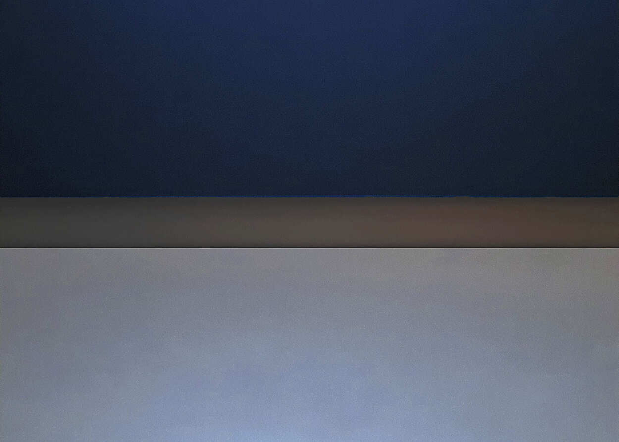 La présence humaine se joue sur un mode indirect par des signes, vestiges purement graphiques qui entrent en tension avec l’horizontalité des trois éléments, terre, mer, ciel. La composition est rigoureusement pensée, maîtrisée, d’une picturalité assumée. Elle puise son esthétique dans le passé de l’iconographie chrétienne en inversant ses valeurs : le ciel est foncé, la terre est claire. Cette dimension métaphorique crée de l’étrangeté, un effet de trouble entre réel et fiction. Tout en maintenant une distance aux choses, elle invite à un déplacement du regard.