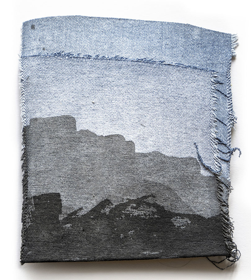 Elle pique avec du fil toiles ou papiers, les imprègne avec de l’encre, grave les plaques à la pointe sèche. Elle explore la répétition des formes, leurs infimes variations. Les tons sont neutres, bruns, noirs, blancs, bleus. Du silence, du vide et paradoxalement une densité de détails qui invitent à une contemplation vagabonde. Une série de petits formats issue du projet Jean Palimpseste – des paysages sur des fragments de jeans usés – est exposée pour la première fois. Nouvelle illustration subtile de l’incessante recherche de l’artiste sur l’expérience sensible du temps, de l’empreinte.