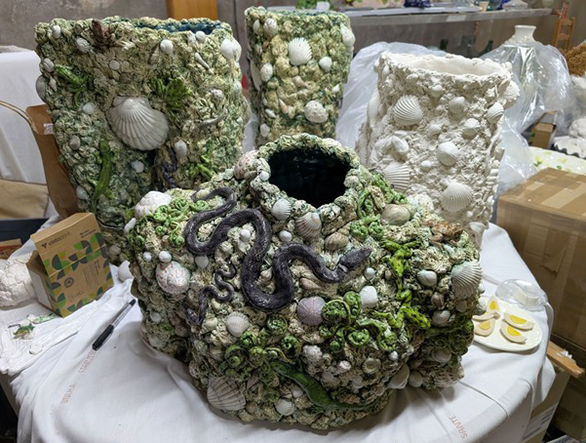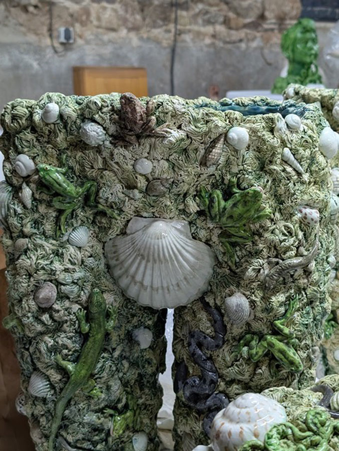 Mais l’artiste ne se limite pas à l’enregistrement littéral. Dans une recomposition baroque et fantastique, ces fragments arrachés au temps sont assemblés en formes hybrides et nouvelles. Bustes ornés de coquillages, têtes de fontaines surgies d’un rêve Renaissance, accumulations de restes domestiques devenus motifs décoratifs : chaque pièce devient un monde où nature et artifice fusionnent. Ces vies silencieuses acquièrent une identité seconde, délivrée des cycles du pourrissement.