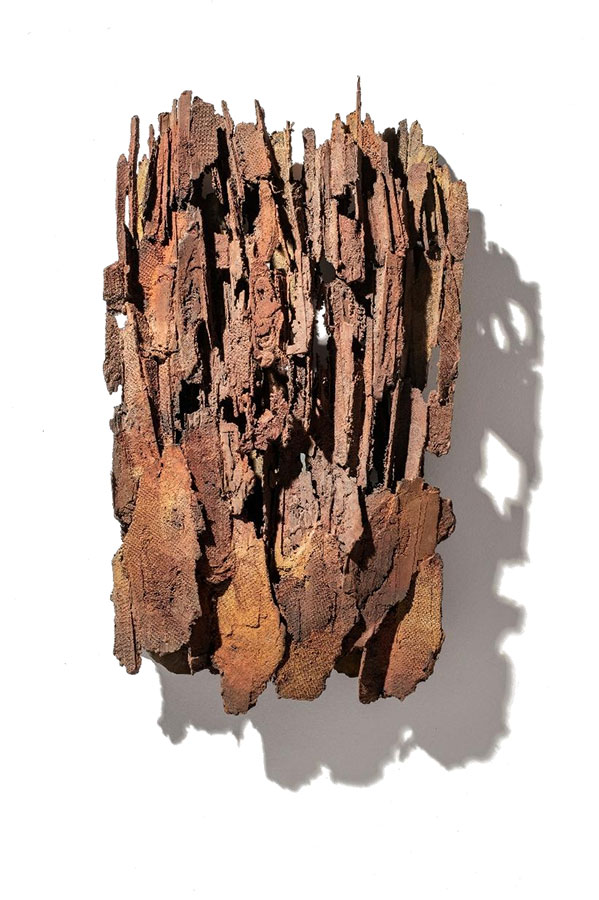 Au cœur de ces fortifications se nichent, à l’ombre des cours de banco lissé, des décors peints de motifs géométriques rehaussés de charbon de bois et de kaolin chaque année après la saison des pluies pour célébrer les traces d’antiques palimpsestes. Comme les marques végétales qui tatouent le bronze brut de décoffrage des sculptures de Guillaume Couffignal