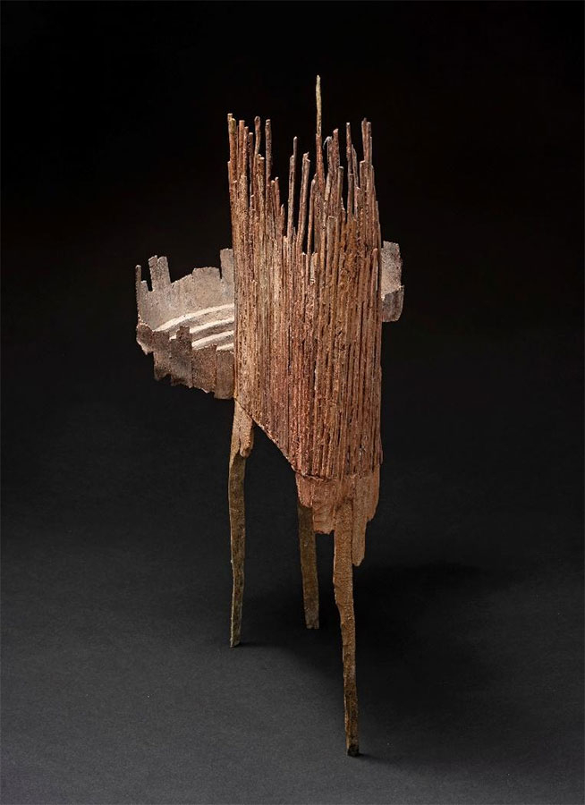 De la récupération à la solution plastique, là réside le génie du créateur. Comme cette pirogue modèle de sa première série d’objets, répondant efficacement à l’utilisation de longs bouts de bois et de vannerie façonnant ces vaisseaux fantômes, « pateras » de migrants et autres pinasses de course.
