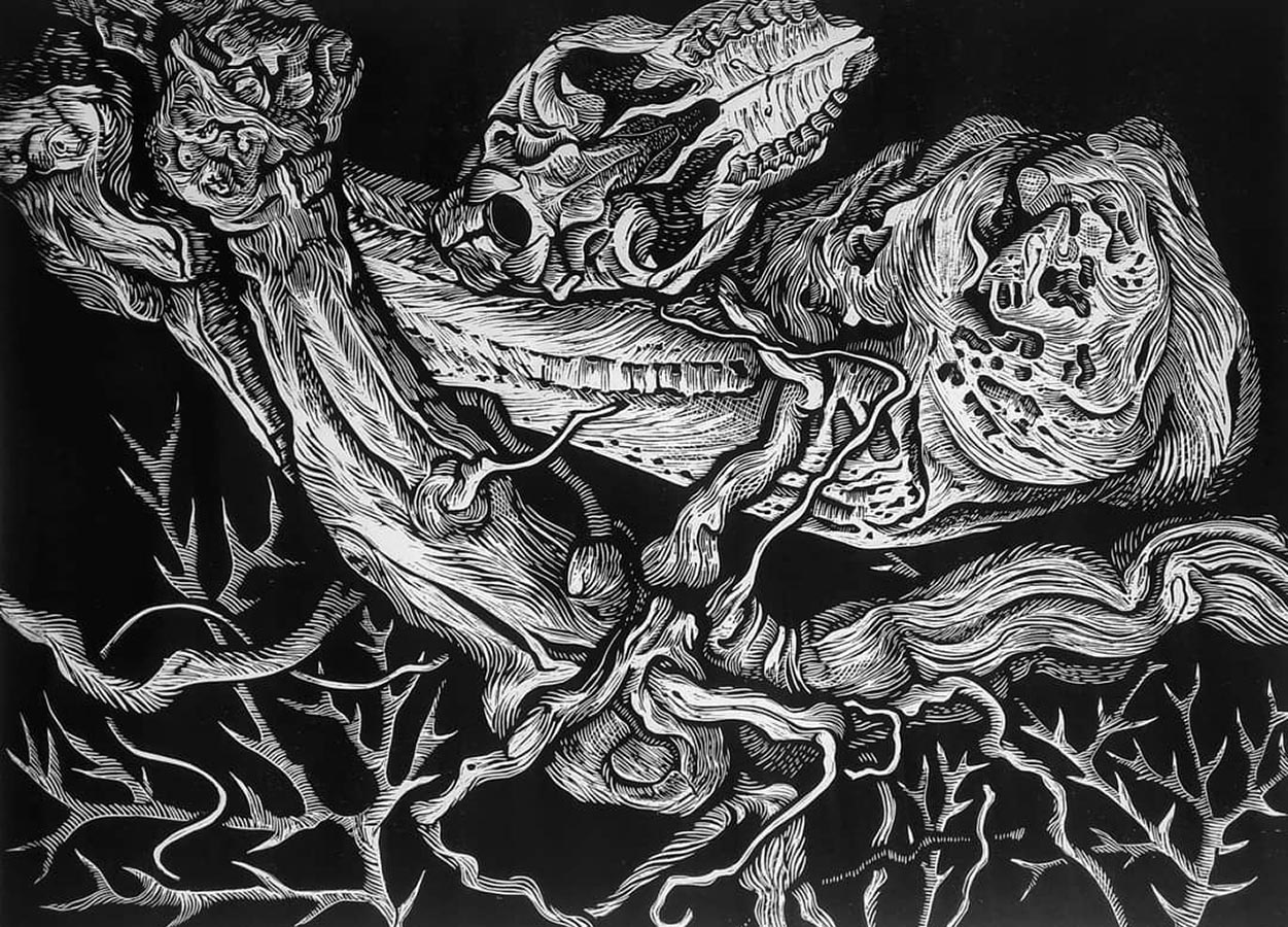 Hélène Damville puise son inspiration dans les formes noueuses des troncs d’arbres, les structures des squelettes ou encore les textures des roches, se rapprochant du sujet autant que possible, pour en dégager des paysages mystérieux.