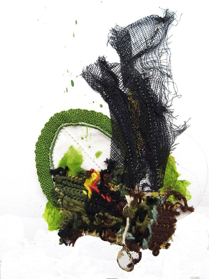 Certaines œuvres construisent de nouvelles interactions, qui me font penser à Kurt Schwitters dans le « carambolage » des matières collectées, inspirées des chutes et rebuts à qui elle donne un nouveau cycle d’existence ; Comme dans les dessins « Plus de clarté (2021-2023) ou « Calice d’Apocalypse » (2023) qui démontre sa façon d’en découdre avec l’inquiétante étrangeté du réel…]. Elisabeth Chambon, conservateur en Chef Honoraire, texte d’introduction du catalogue de l’artiste, « Dans la trame de l’étoffe « 2025 « Penser sur le qui-vive ».