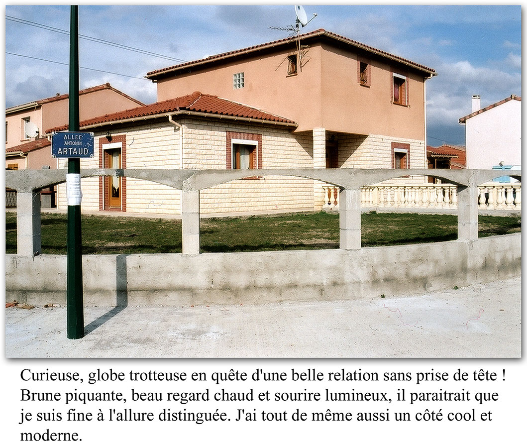 Dans cette exposition entre site de rencontres et zone pavillonnaire dans laquelle je vis, la solitude domine, les murs s’élèvent, les liens se dématérialisent. Et pourtant …Soraya peut débarquer dans ma vie, alors que je jouais avec des légos, tout en recevant quelques courriels…