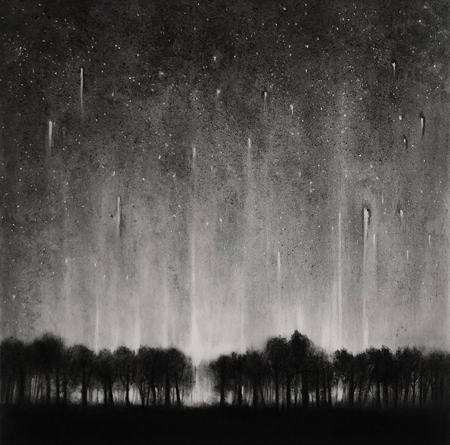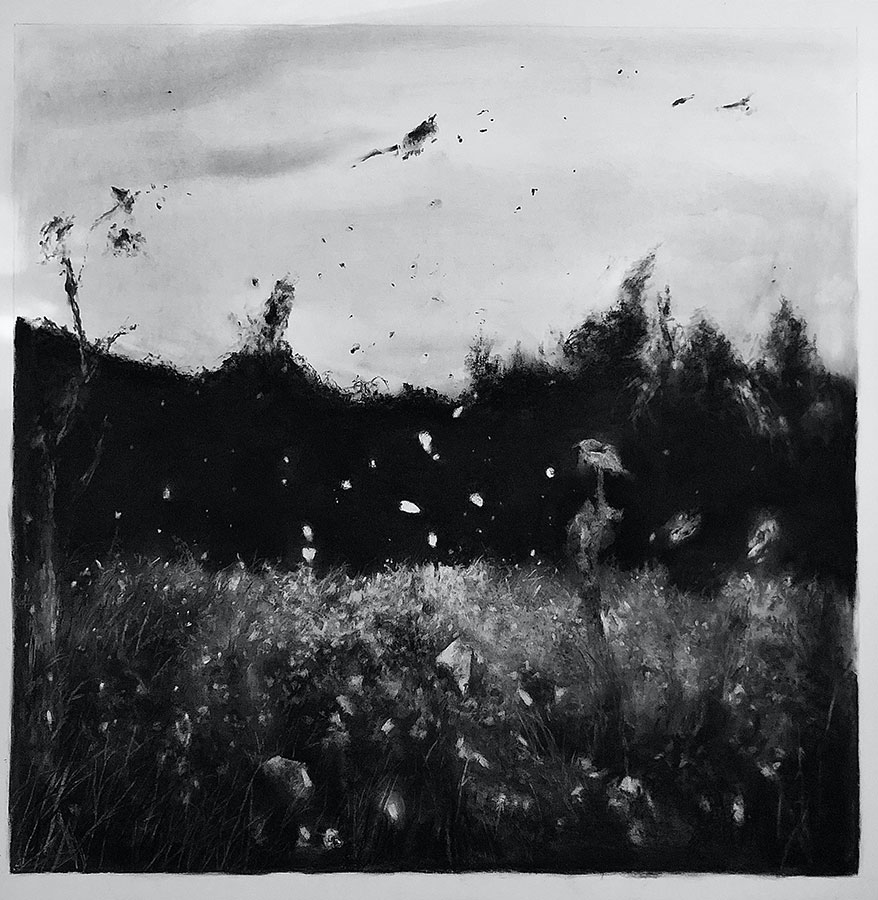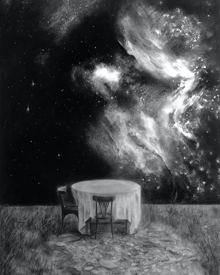 À l’heure exacte où une brèche entre les jours se crée. Ses dessins, réalisés au fusain, pierre noire et graphite s’y immiscent et amènent le spectateur en des lieux où l’invisible devient perceptible, où tout devient possible…