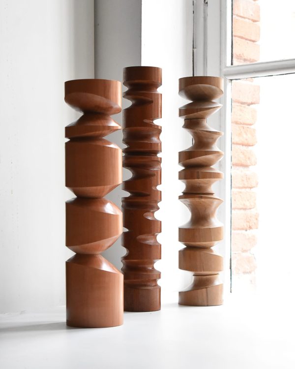 Les sculptures totems de Samuel Latour prolongent cette réflexion sur l’ancrage et la verticalité. Sa pratique s’inscrit dans une relation intime avec la matière. Il travaille le bois et le bronze avec un même souci de dialogue entre technique et intuition. À travers des gestes précis — tournage, moulage, ciselure — il explore les tensions entre lignes souples et formes structurées, entre équilibre et mouvement.