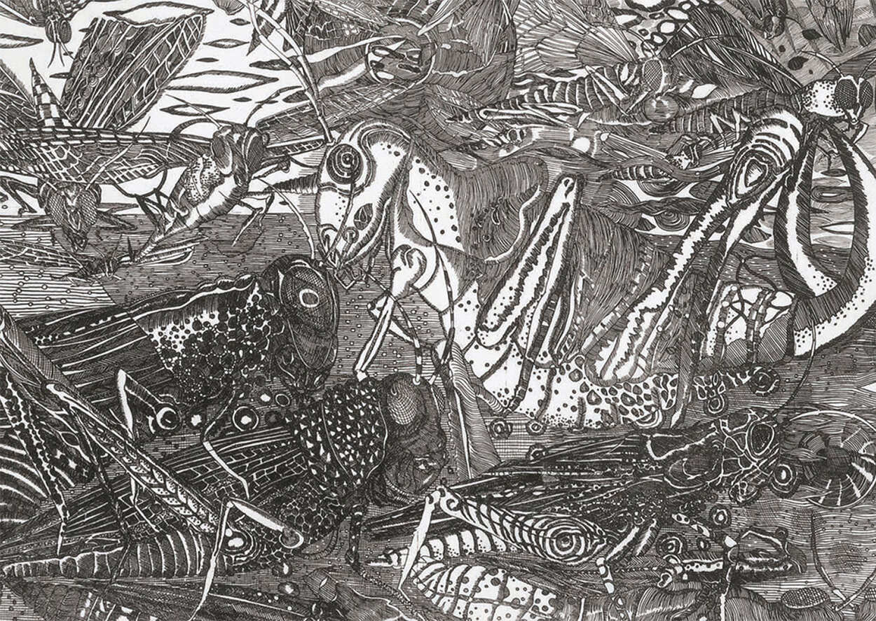 Pour elle, la gravure est une forme d’écriture, un automatisme dans lequel tous les traits qui forment la structure de fond sur la plaque sont dessinés à la main dans le vernis appliqué sur le métal, sans esquisse préalable, sans projection. Elle commence à un point précis de la plaque, puis tout se développe comme une toile d’araignée. C’est un processus, une aventure, comme la composition qui trouve son chemin…