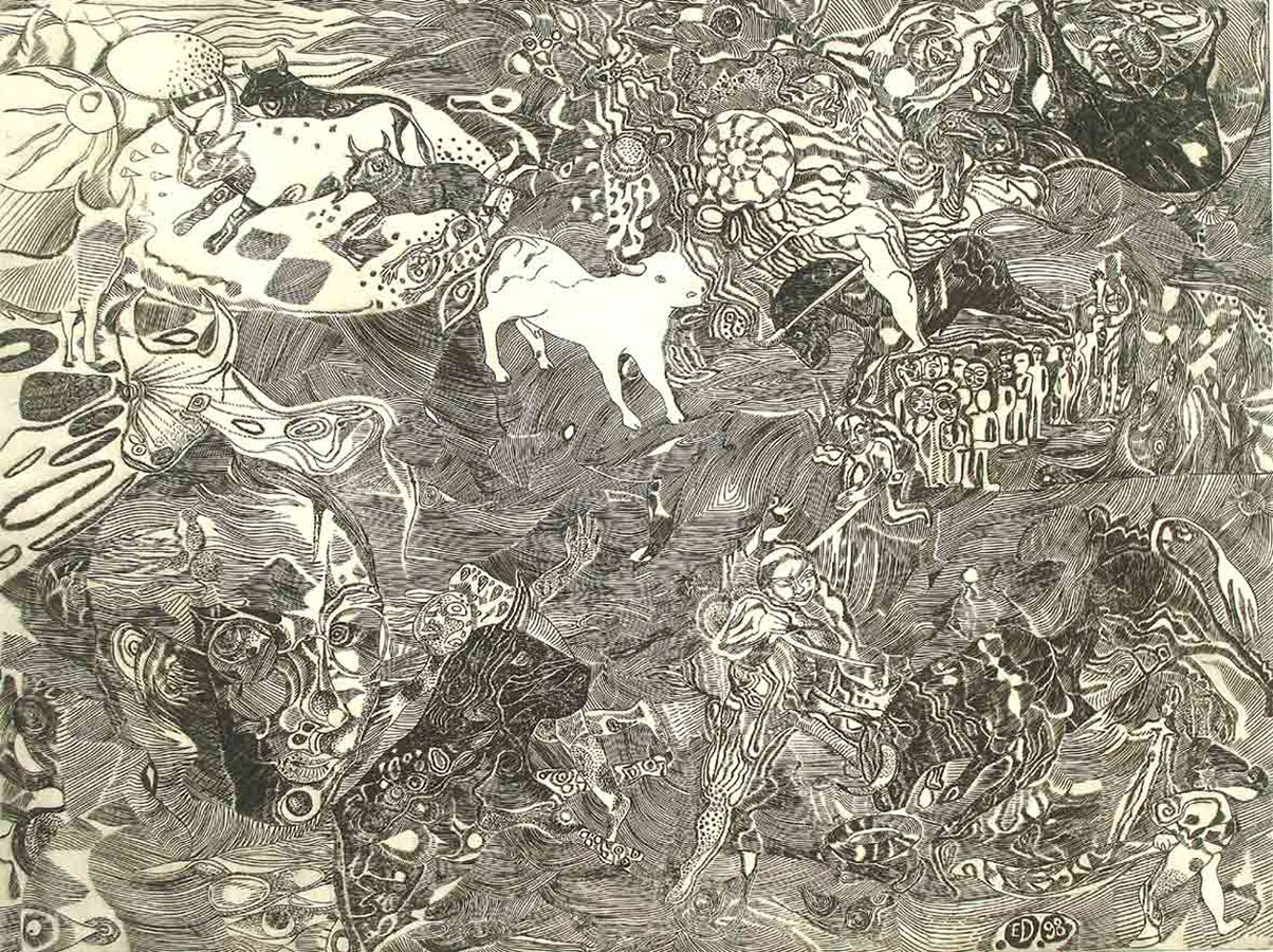 Dans le cadre de son exposition „Los toros“, qui a eu lieu en 1999 au Musée Goya á Castres, Jean-Louis Augé, le directeur du musée, lui propose de travailler également pour une édition de gravures. C’est ainsi que naissent á partir de 1997 ses premiers burins sur cuivre „Taureaux d’apocalypse“, „Le paradis et l’enfer“ et „
