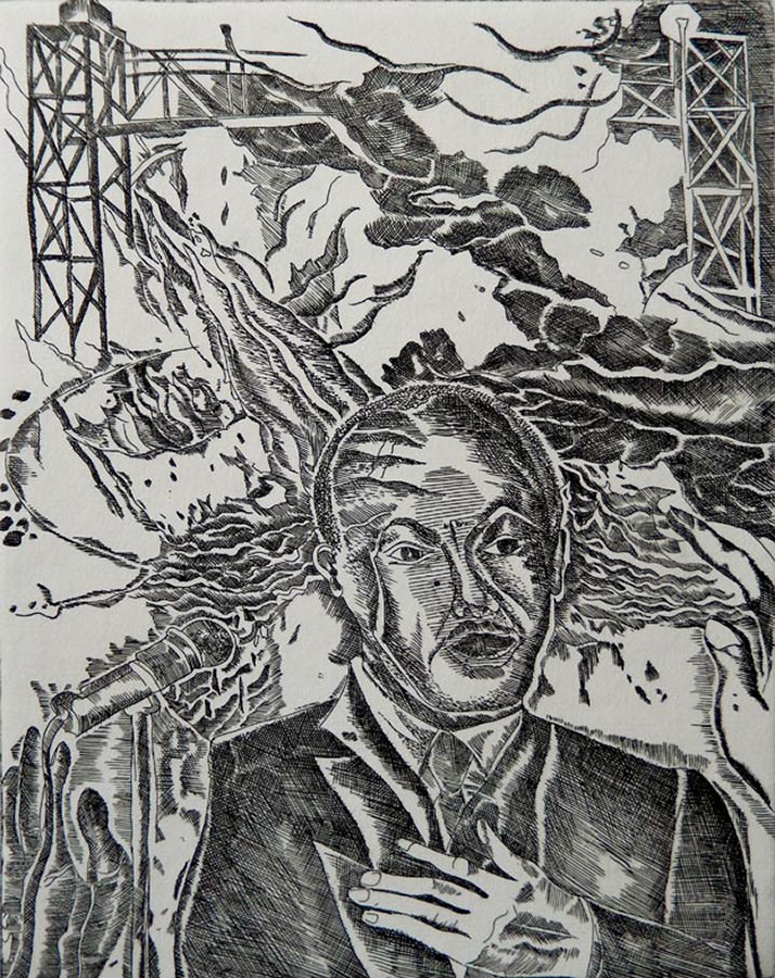 En tant que boursière de l’Ohio Art Council, États-Unis, en 2019, elle a passé six semaines au Zygote Press, un atelier de gravure à Cleveland, Ohio. Son attention s’est portée sur les contrastes aux États-Unis entre les gratte-ciel et les sans-abri. Elle a ensuite découvert l’histoire des Afro-Américains, en particulier celle de Carl B. Stokes, le premier maire noir de Cleveland, qui a transformé la rivière Cuyahoga, complètement polluée et qui avait pris feu pour la dernière fois en 1969, en une oasis de verdure… C’est ainsi qu’est née sa „Cleveland Suite“.