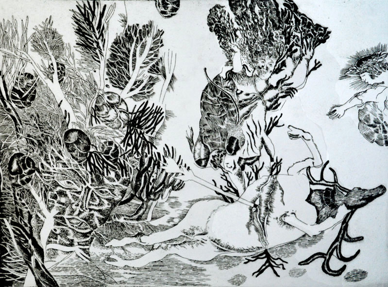 Le début de son histoire explique son processus créatif actuel : elle continue à travailler au trait aux eaux-fortes, parfois combinés à d’autres techniques de gravure telles que l’aquatinte et la manière noire.