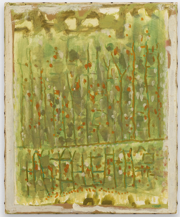 Parce que des figures et des objets apparaissent au milieu de tableaux ou qu’une croix en divise verticalement et horizontalement l’espace, parce que la page accueille plusieurs idées de composition, chacune contenue dans un carré ou une planche – comme on en délimite dans un jardin –, parce que le bloc de texte d’une page imprimée a posé la zone à investir et que les marges autour deviennent dès lors bordures, lesquelles, omniprésentes tant dans les peintures sur toile que dans les œuvres sur papier, sont tantôt en creux (laissées vierges), tantôt bandes de couleurs, posées d’abord ou pour finir : quoi qu’il en soit, l’espace est autant donné par le format du support que décidé par l’artiste, instauré dans des limites qui assurent l’autonomie de ses compositions tout en leur supposant un extérieur et la possibilité d’établir des échanges, sous certaines conditions.