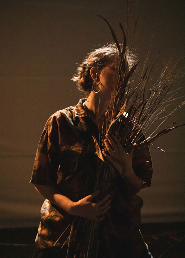 À travers la création de costumes et de formes scénographiques envisagées comme des extensions du corps (peaux, écorces, coquilles, mues, enveloppes), les matériaux organiques (paille, cire, argile…) et les formes sculpturales évoquent des corps en mutation, pris dans un monde aux équilibres fragilisés…