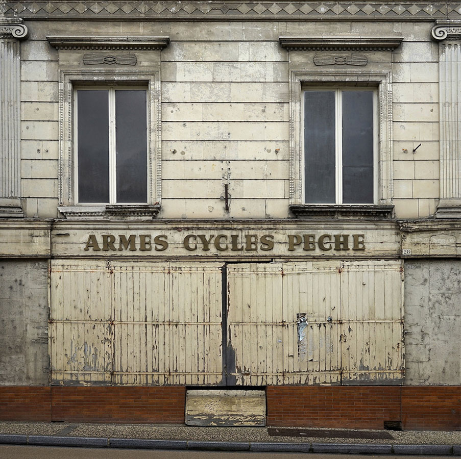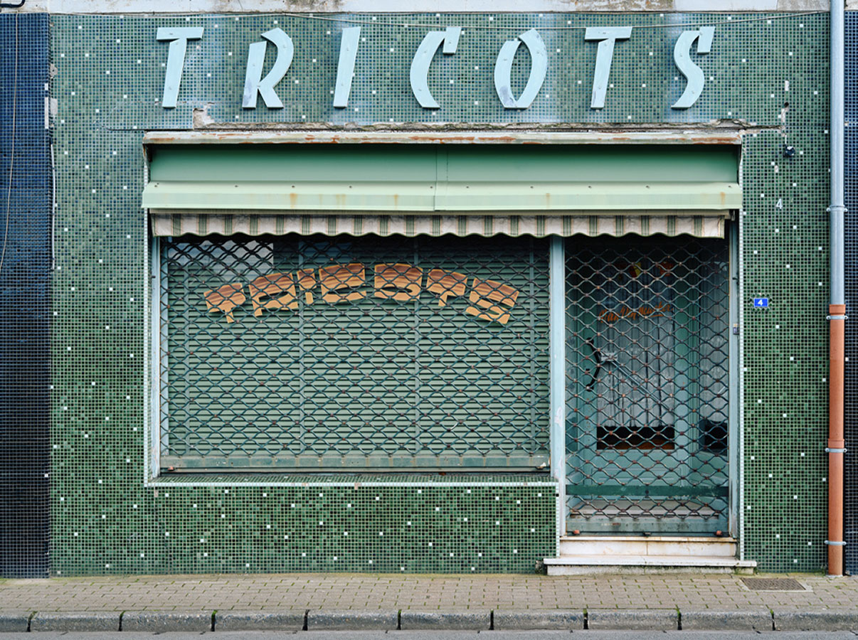 Ces petits commerces peuplent la ville fantôme de Thibaut Derien, formant un cimetière, un varia de traces, de vestiges d’une époque révolue, balayée par les industriels, les franchises et l’indifférence de clients envoutés par les sirènes de la consommation de masse et ses temples de tôle et de parpaings. Dans ce cimetière de boutiques, les rideaux sont baissés, tirés, les portes scellées, les fenêtres murées. Les devantures étouffent dans un cadre strict, qui éclipse tout le reste. Cette frontalité réduit les boutiques à leur seule façade, excluant toute profondeur de champ, anéantissant les volumes susceptibles de réanimer ces ruines exsangues et réduisant au silence ce qui faisait la particularité de ces commerces de proximité : le lien social.